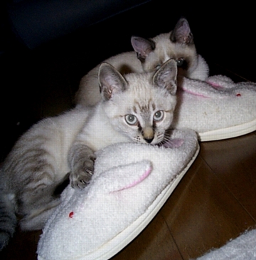 With his long legs, Tippy somewhat resembles a rabbit with short ears. Here he plays with a bunny slipper. | ||||||||||||||||||