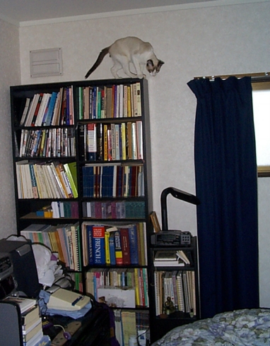 Tippy is very adept at climbing and mounted the top of the bookcase when he was only about 6 months old. | ||||||||||||||||||